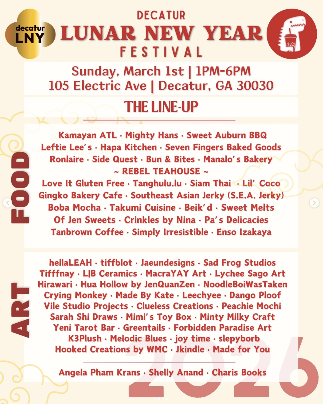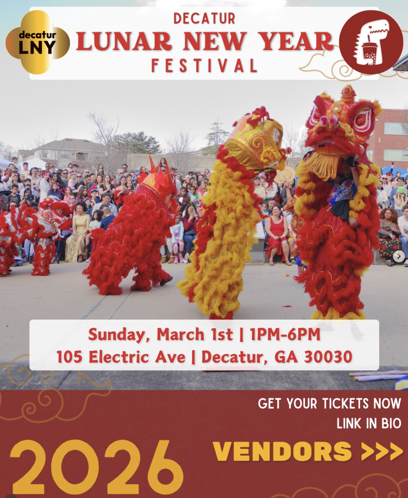 Back to All Events Decatur Lunar New Year Festival Sunday, March 1, 2026 1:00 PM 6:00 PM 105 Electric Avenue Decatur, GA, 30030 United States (map) Google Calendar ICS